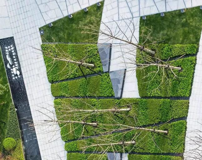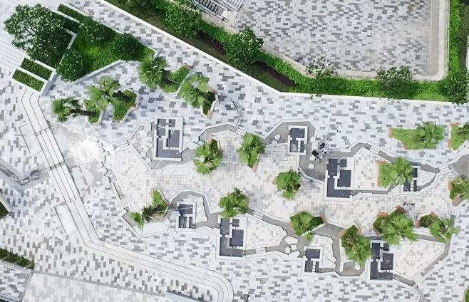 ??用線條勾勒出美,利用線條的隨意性,創(chuàng)造不同的視覺空間感,令人們對公共空間的規(guī)劃尺度形成感知。直線形的線條鋪裝引導(dǎo)游人前進(jìn);在需要游人駐足停留的場所,則采用無方向性或穩(wěn)定性的鋪裝;通過鋪裝線條的變化,可以強(qiáng)化空間感。
