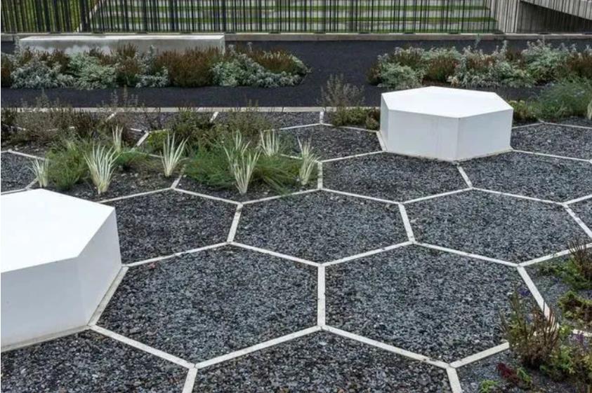 礫石,或者草地一般用于連接各個景觀、或規則的整形之間,無論采用哪種方式,礫石(草坪)由于其尺度較小,用于填充自然的鋪裝邊界,效仿自然的不規則鋪裝,使人聯想到鄉間、荒野,更具有樸素自然的感覺。