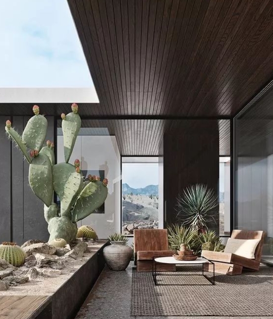 除了木石和植物、桌椅家具之外,還可以在室內與室外庭院之間,選擇使用一面大大的落地窗。對室內而言,不僅增加了空間的采光,而且人們在室內也可以坐看花開花落、云卷云舒,同時還不會遭受惡劣天氣的影響,烹煮一杯茶,靜享閑暇愜意的時光,感悟禪意滋味。